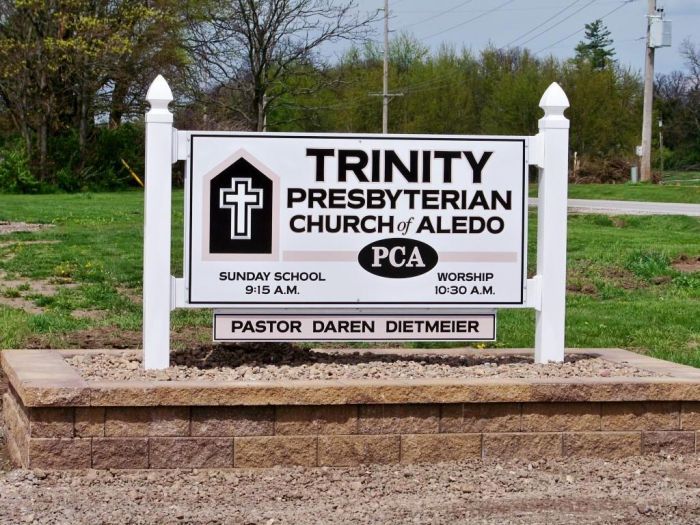 Trinity Presbyterian Church is located at 780 State Highway 94 in Aledo, Illinois. It is located just beyond the south edge of town. From the stoplight in downtown Aledo (intersection of Highway 94 and Route 17), it is 1.2 miles south along Highway 94, situated on the right (west) side of the road. It is a little over a half-mile south of Mercer County High School. Look for this sign on the highway!